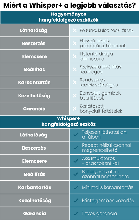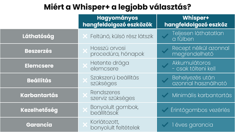 Igen, sőt! A Whisper+ kifejezetten a hallókészülék használatban járatlan felhasználók számára is terveztük. Egyszerű kezelés, automatikus funkciók, nincs szükség szakszerű beállításra.