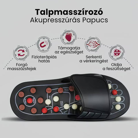 A papucson található egy kis vonalakkal ábrázolt “térkép”, mely a legfontosabb reflex-zónáinkat mutatja meg, ezenkívül pedig több, mint 20 akupresszúrás masszázsgömb van a papucs talpán.