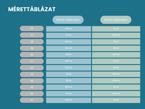 A mezítlábas kialakítás miatt javasoljuk a pontos lábhossz mérést, és a mérettáblázat használatát. Ha bizonytalan, szívesen segítünk a választásban.