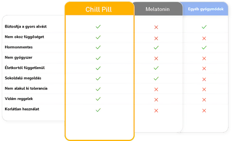 Ha hetekig, hónapokig vagy akár évekig gyógyszert használunk az elalváshoz, nagy a valószínűsége annak, hogy függőség alakul ki. Valójában a legtöbb ember toleranciát épít ki, és az idő előrehaladtával csak növeli az adagot. De a Chill Pill esetében nincs hajlam a függőségre, nincs tolerancia szint, és a hosszú távú használat ténylegesen támogatja a mentális állapotodat, hogy többé ne legyen szükséged semmiféle alvás- vagy nyugtató gyógyszerre!